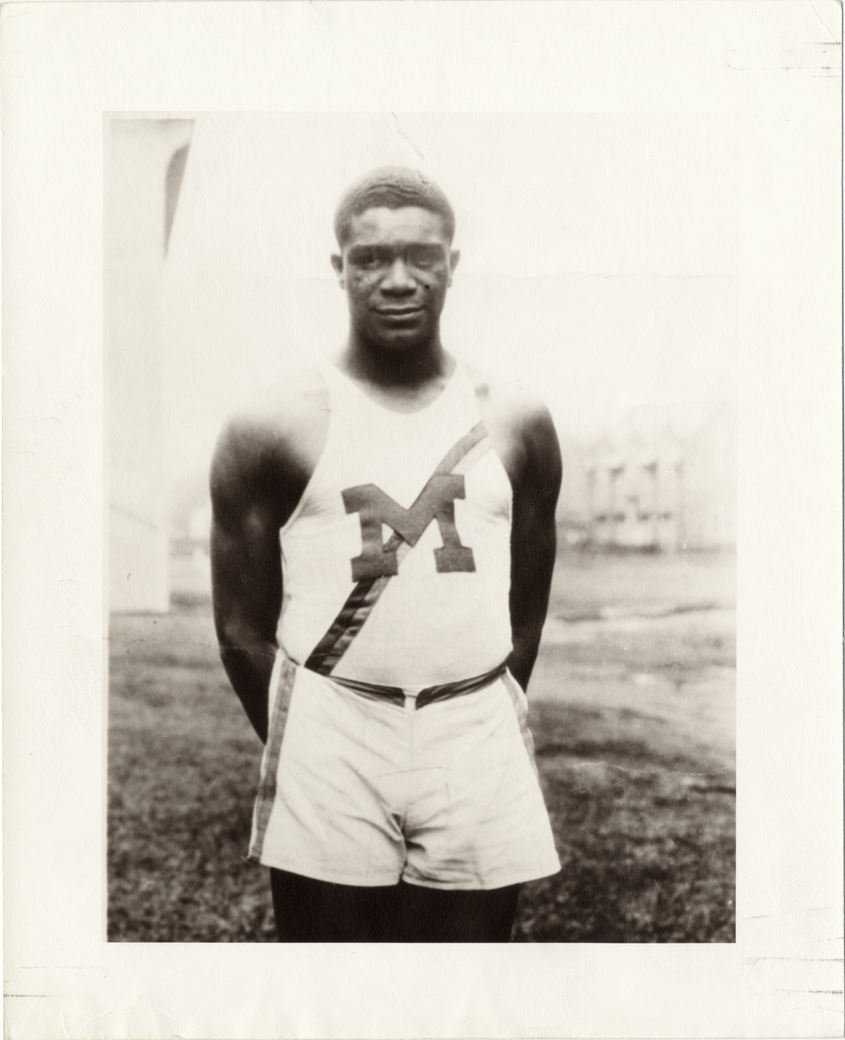 Portrait of Willis F. Ward, wearing track and field uniform. Handwritten on back: "Willis Ward."