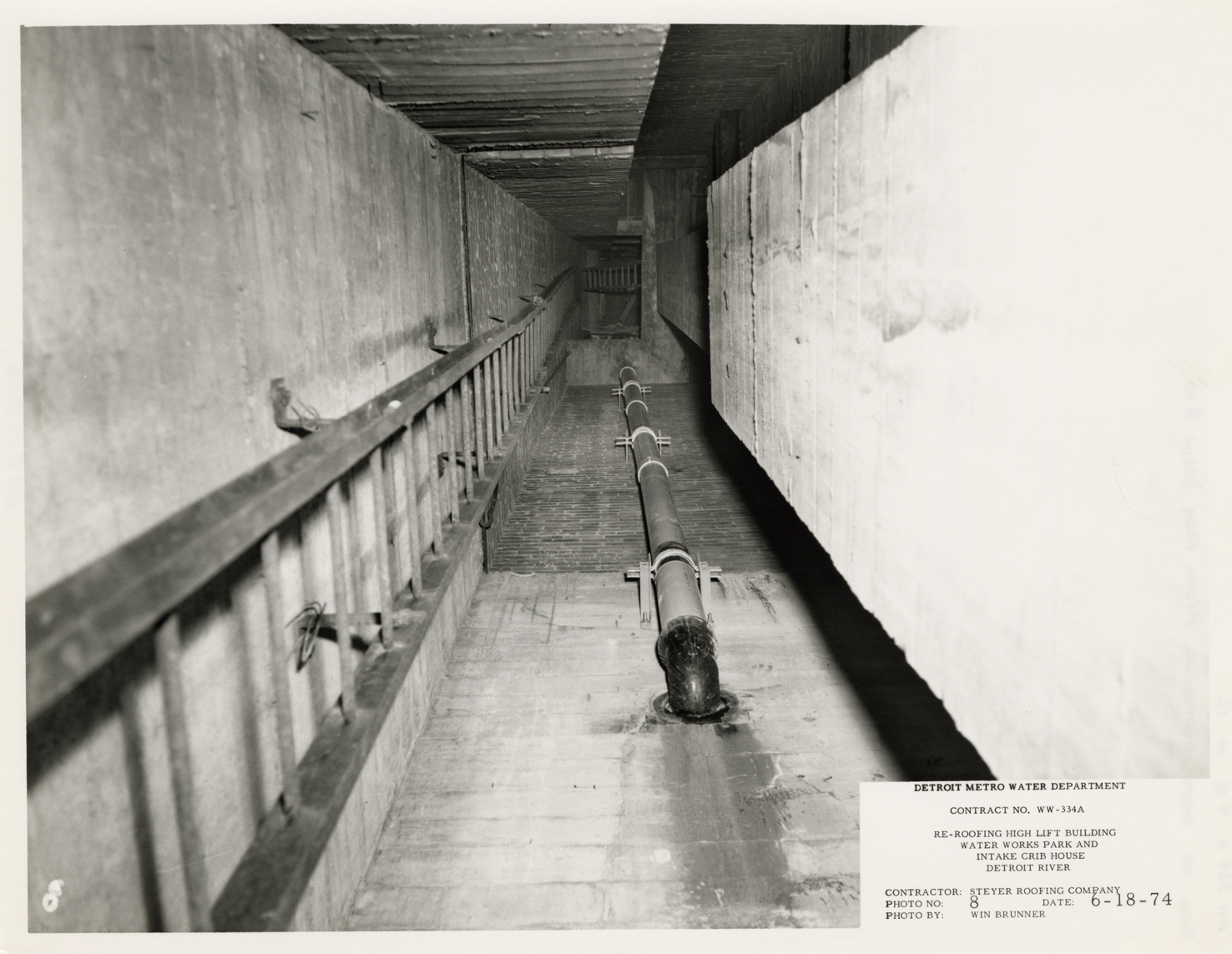 View of shaft containing piping from drain #10, Waterworks Park, Detroit water supply system. Printed on front: "Detroit Metro Water Department. Contract no. WW-334A. Re-roofing high lift building. Water Works Park and intake crib house, Detroit River. Contractor: Steyer Roofing Company. Photo no. 8. Date: 6-18-74. Photo by Win Brunner." Handwritten on back: "WW 334A, #8 of 12. View of shaft containing piping from drain #10."