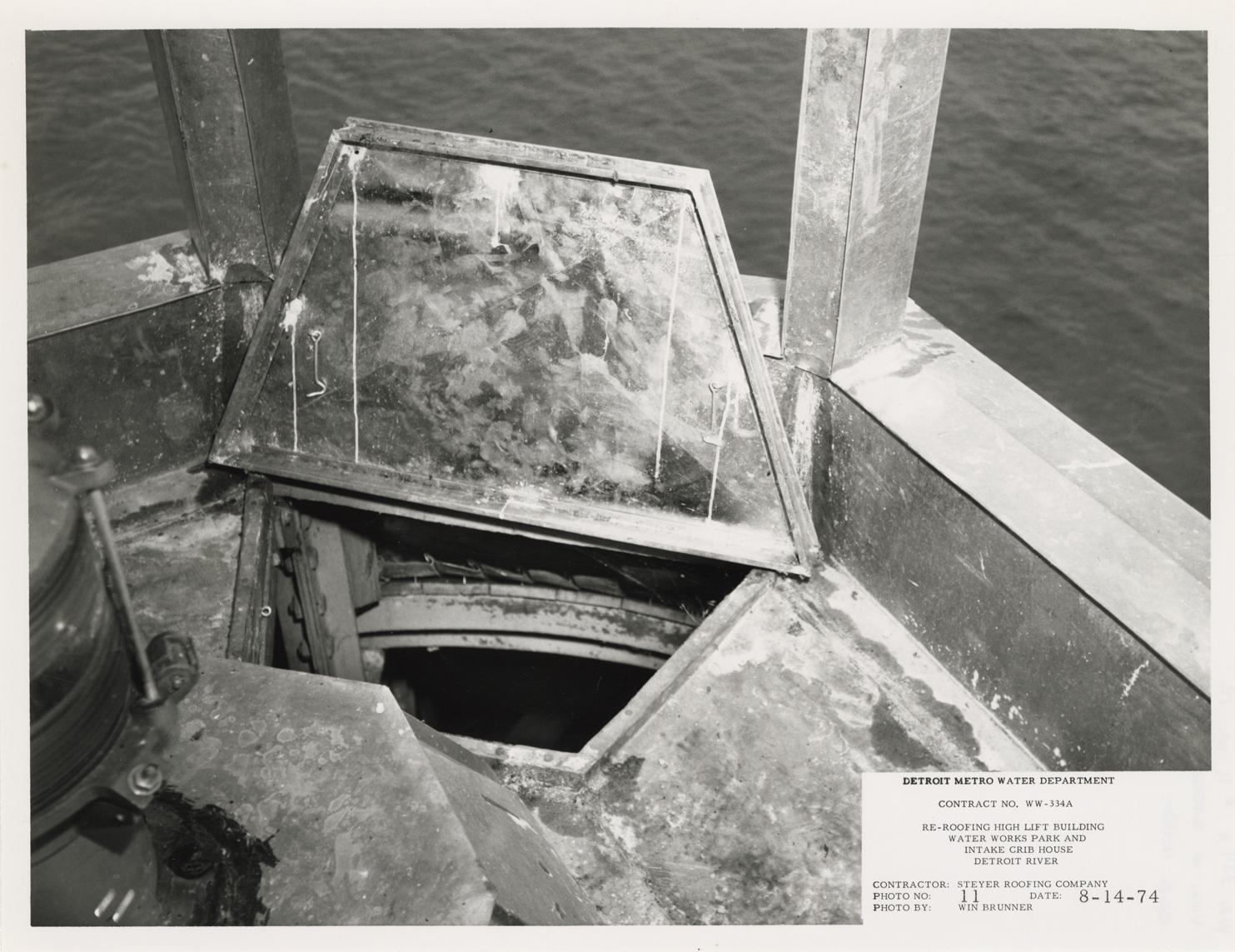 View of interior floor and hatch of intake crib cupola, Waterworks Park, Detroit water supply system. Printed on front: "Detroit Metro Water Department. Contract no. WW-334A. Re-roofing high lift building. Water Works Park and intake crib house, Detroit River. Contractor: Steyer Roofing Company. Photo no. 11. Date: 8-14-74. Photo by Win Brunner." Handwritten on back: "WW 334A, #11 of 12. View of interior floor, including hatch, of the cupola on the intake crib house."