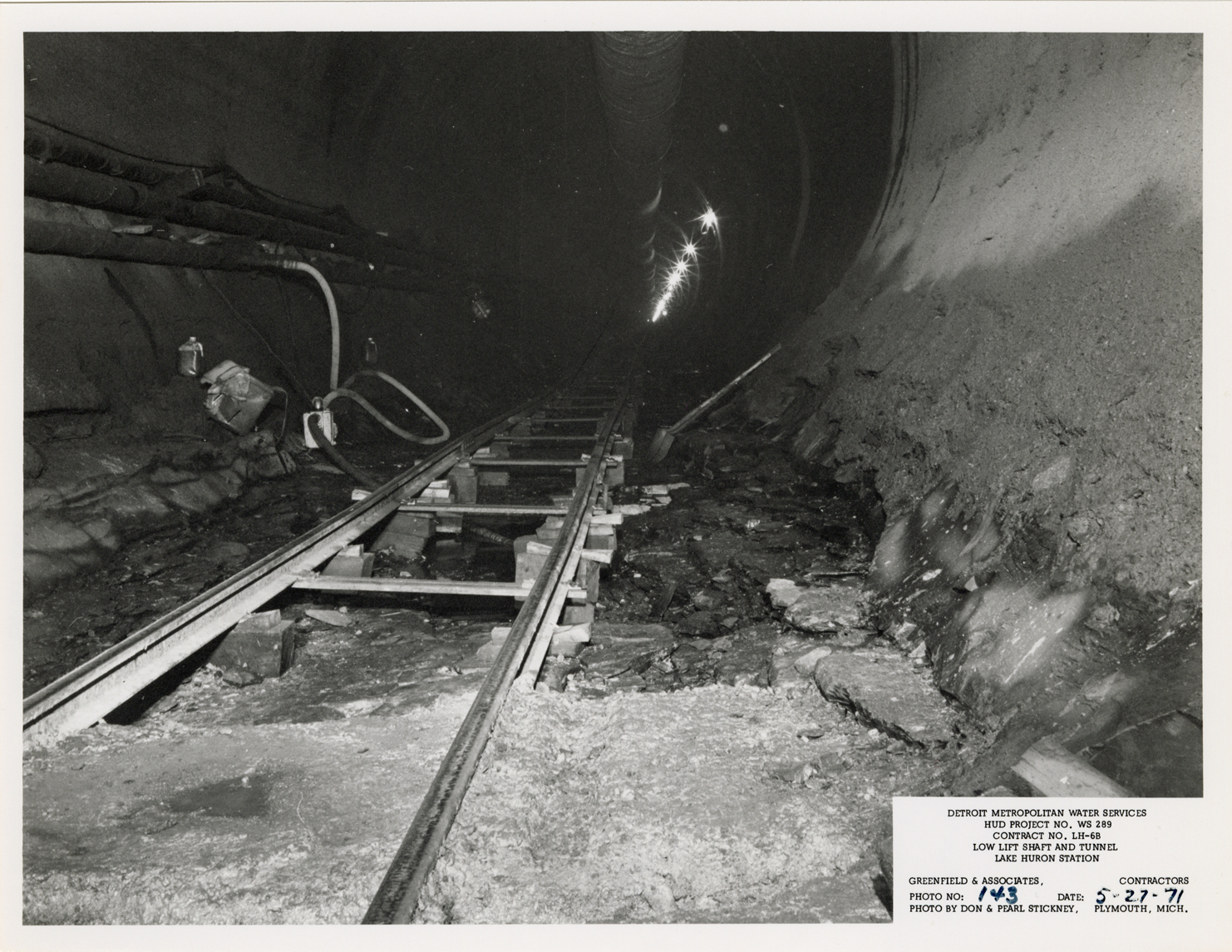 View of tunnel during construction, Lake Huron Station, Detroit water supply system. Printed on front: "Detroit Metropolitan Water Services. HUD Project no. WS 289. Contract no. LH-6B. Low lift shaft and tunnel. Lake Huron Station. Greenfield & Associates, contractors. Photo no: 143. Date: 5-27-71. Photo by Don & Pearl Stickney, Plymouth, Mich."