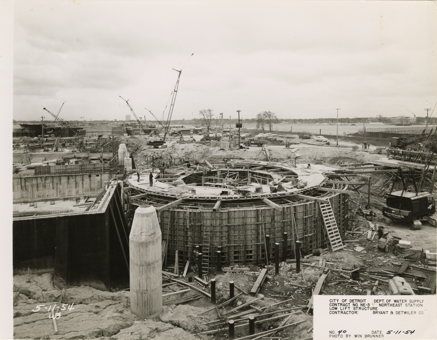View of low lift plant during construction, Northeast Station, Detroit water supply system. Printed on front: "City of Detroit. Dept. of Water Supply. Northeast Station. Contract no. NE-3. Low lift structure. Contractor: Bryant & Detwiler Co. No. 40. Date: 5-11-54. Photo by Win Brunner." Typed on back: "No. 40. View of formwork between elev. 129'-6" + - and elev. 143'-6" looking south from roof of temporary boiler house."