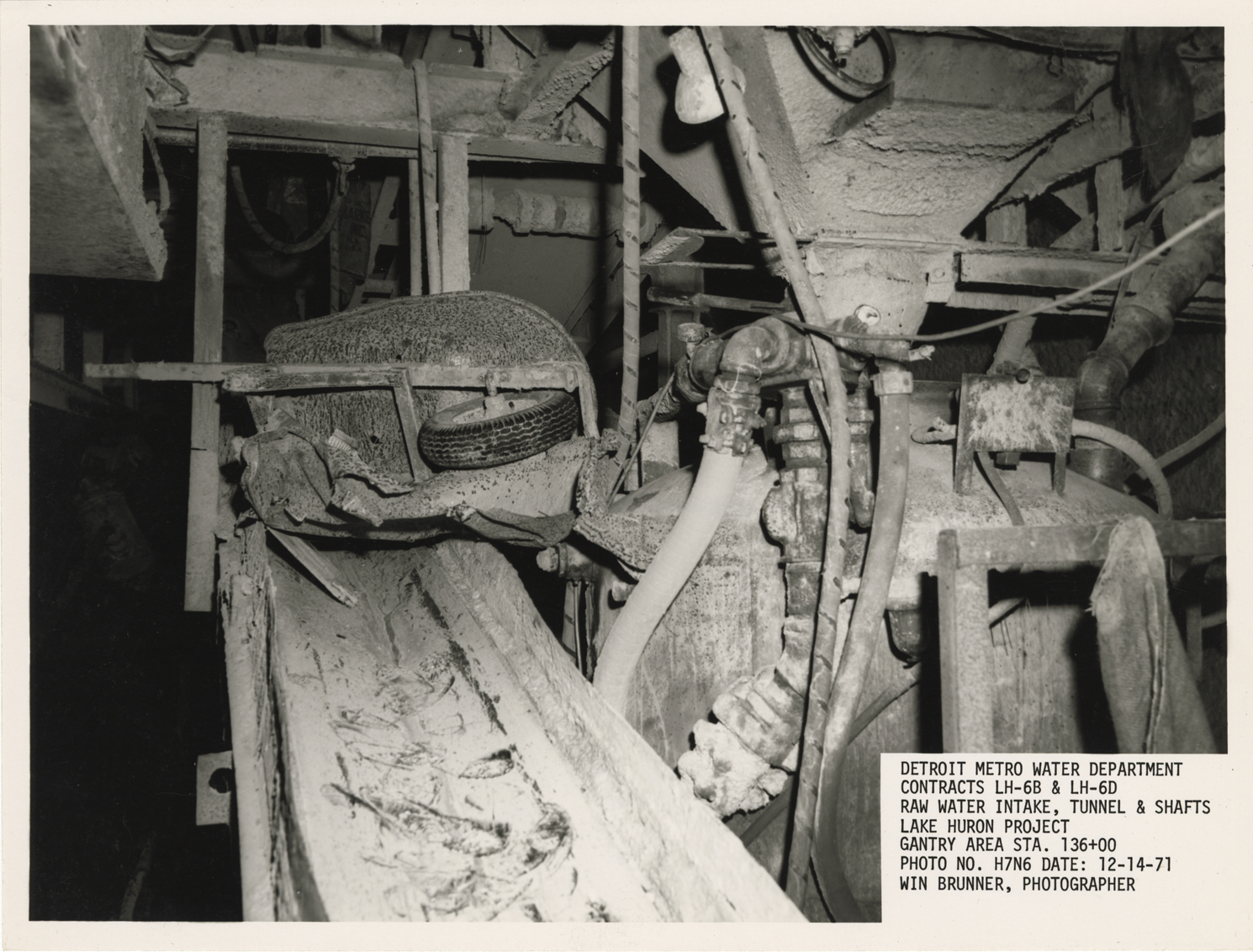 View of gantry area, Lake Huron Station, Detroit water supply system. Printed on front: "Detroit Metro Water Department. Contracts LH-6B & LH-6D. Raw water intake, tunnel & shafts. Lake Huron Project. Gantry area Sta. 136+00. Photo no. H7N6. Date: 12-14-71. Win Brunner, photographer."