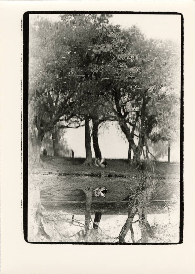 View of a man and woman sitting under a tree at the edge of a pond. Trees are reflected in water. Label on back: "Michigan Thumb area--Nature--Reflections of couple and trees."