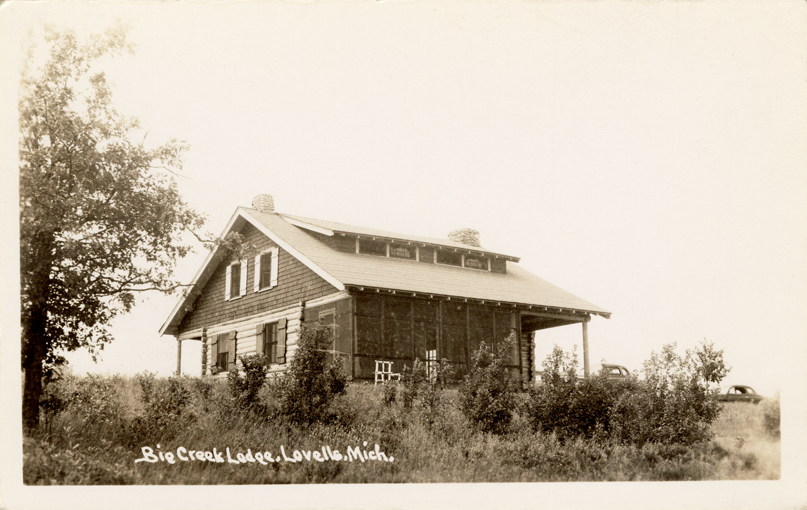 View of Big Creek Lodge at Lovells, Michigan. Printed on front: "Big Creek Lodge, Lovells, Mich."