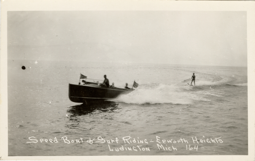 View of a speedboat pulling a water-skier at Ludington, Michigan. Printed on front: "Speed boat & surf riding, Epworth Heights, Ludington, Mich."
