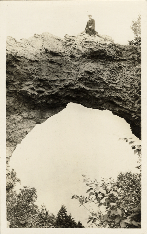 Man posing on Arch Rock, Mackinac Island, Michigan