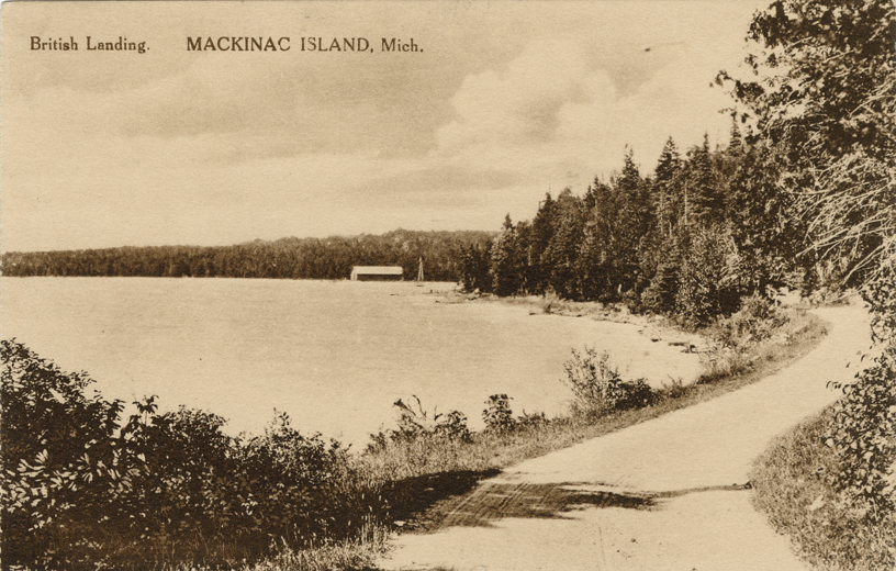 View of shoreline and dirt road on Mackinac Island, Michigan. Printed on front: "British landing, Mackinac Island, Mich." Printed on back: "The Albertype Co., Brooklyn, N.Y."