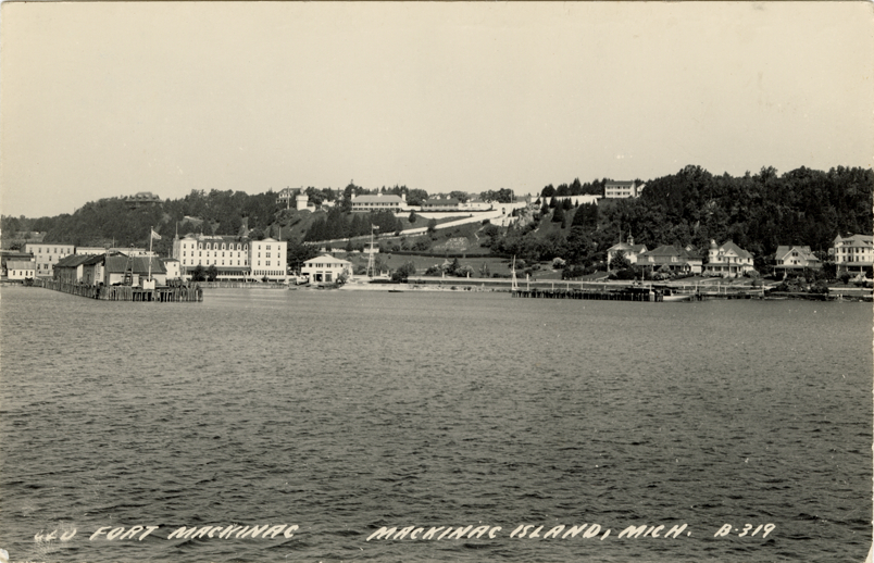 Distant view of the Fort Mackinac on Mackinac Island, Michigan. Printed on front: "Old Fort Mackinac, Mackinac Island, Mich." Printed on back: "All rights reserved. The L.L. Cook Co., Milwaukee."