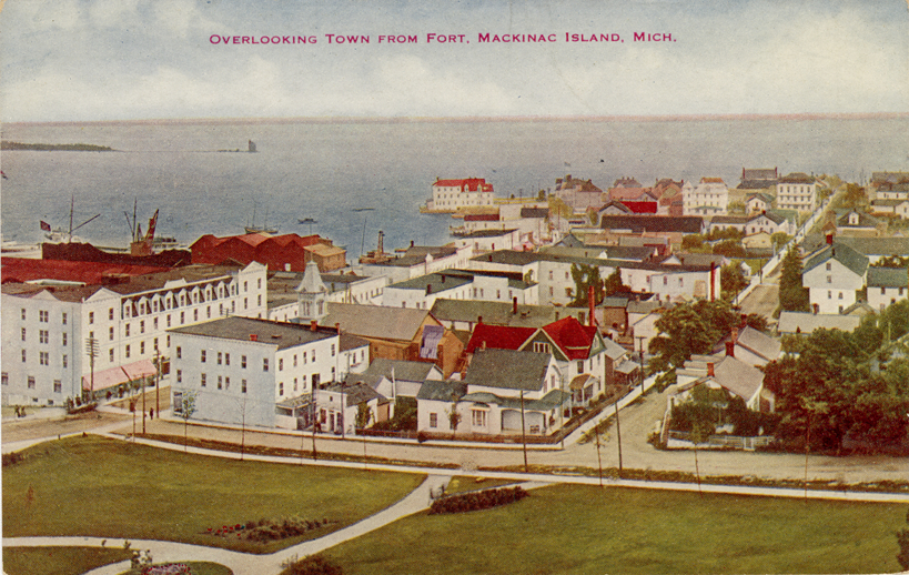 View of Mackinac Island, Michigan from Fort Mackinac. Printed on front: "Overlooking town from Fort, Mackinac Island, Mich." Printed on back: "1244. V.O. Hammon Pub. Co., Chicago."