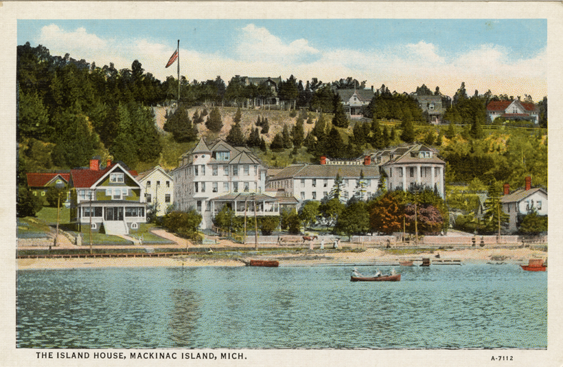 View of the Island House hotel on Mackinac Island, Michigan. Printed on front: "The Island House, Mackinac Island, Mich." Printed on back: "G.H. Wickman, Mackinac Island, Mich. Made in U.S.A. C.T. American Art Colored. CT Co., Chicago."