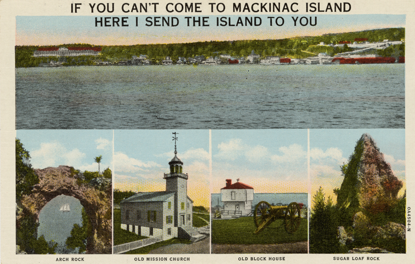 View of a souvenir postcard from Mackinac Island, Michigan, showing scenes of the Island. Printed on front: "If you can't come to Mackinac Island, here I send the Island to you. Arch Rock, old Mission Church, old block house, Sugar Loaf Rock." Printed on back: "G.H. Wickman, Mackinac Island, Mich. Made in U.S.A. 'C.T. American Art' (reg. U.S. Pat. Off.)"