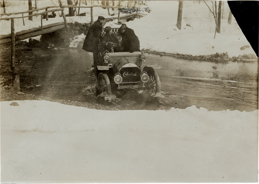 View of motorists in Chadwick car fording a stream during winter. Snow-covered rustic wooden bridge in background. Stamped on back: "Photo by F. Ed. Spooner, 1536 B'way, telephone 6536-38th St., New York, N.Y."
