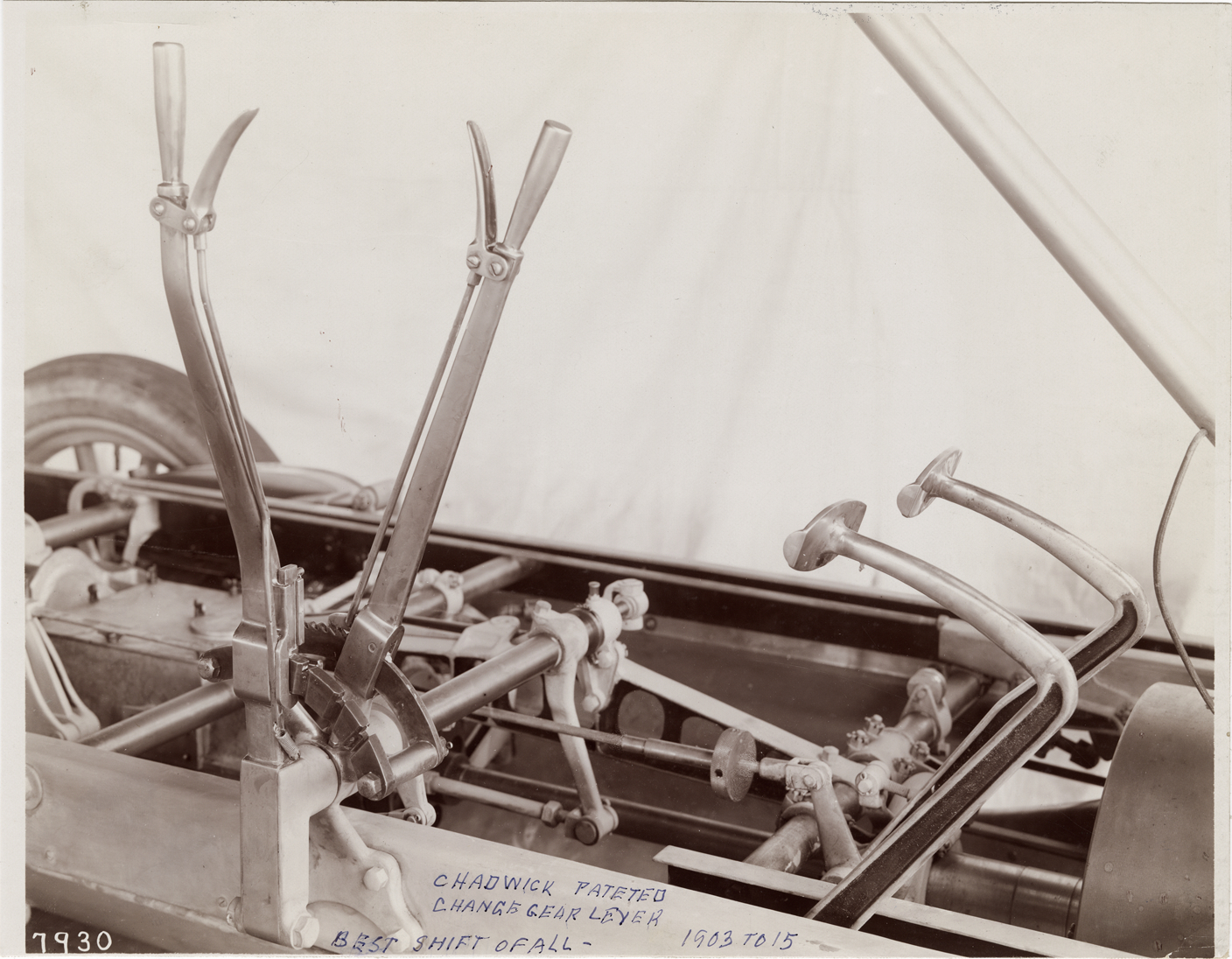 View of a gear lever for a Chadwick car. Handwritten on front: "Chadwick pateted [sic] change gear lever. Best shift of all. 1903 to 15." Handwritten on back: "Chadwick."