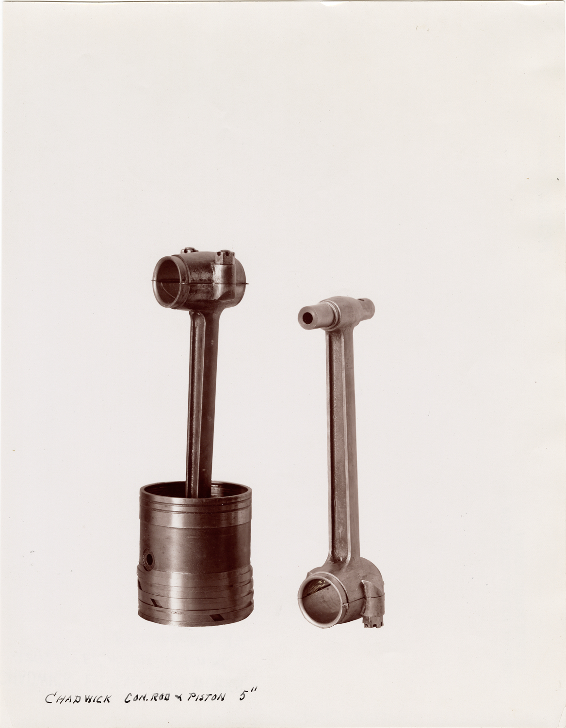 View of a rod and piston for a Chadwick car. Handwritten on front: "Chadwick, con. rod & piston, 5"." Stamped on back: "Chadwick Engineering Works, 3207 to 11 Spring Garden St., Philadelphia, Pa." Handwritten on back: "Chadwick."