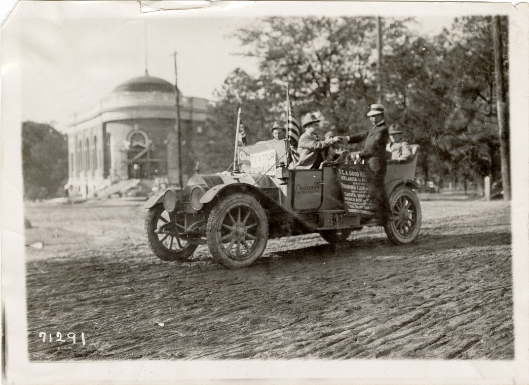 View of motorists in a 1912 Chalmers car during the 1911 Good Roads Tour sponsored by the Touring Club of America. Sign on car reads: "T.C.A. Tour official car." Banner reads: "T.C.A. good Roads Tour, Atlanta to Richmond, direction of Touring Club of America under auspices of Capital Highway Assn., American Assn. for Highway Impt., 1st American Road Congress, Richmond, Va., Nov. 20-24, the Blue Book route, Chamber of Commerce, Richmond, Va." The tour covered a route from Atlanta, Georgia to Richmond, Virginia. Stamped on back: "Spooner & Wells, Inc., photographers, telephones 3472-3473 Columbus, 1931 Broadway, New York." Handwritten on back: "Chalmers, 1912."
