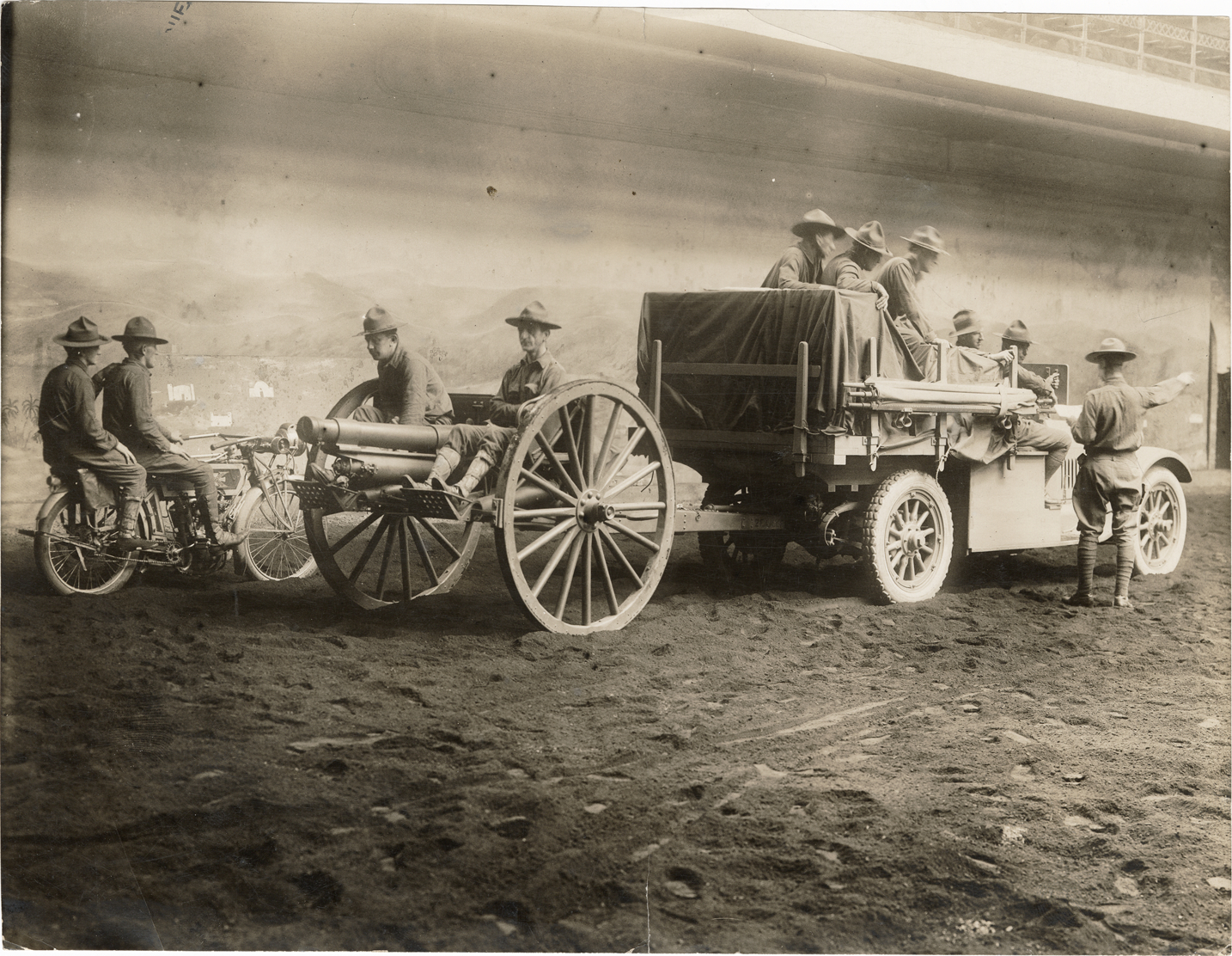 Soldiers in 1915 Chalmers automobile, towing a howitzer