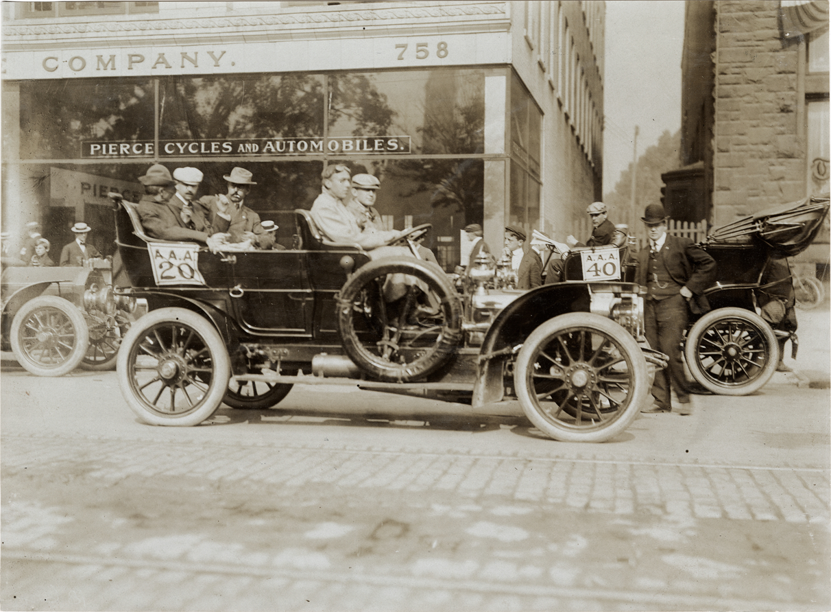 View of motorists posing in Clement-Bayard car. Sign on car reads: "A.A.A. 20." Handwritten on back: "Clement-Bayard, ca. 1906."