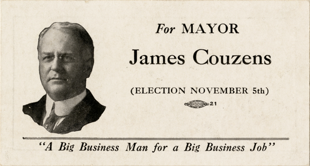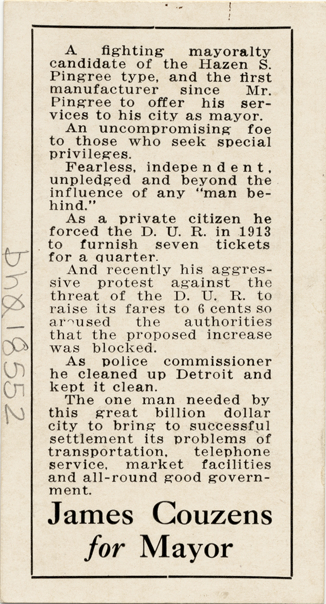 View of campaign card for James Couzens, candidate for mayor of Detroit. Printed on front: "For mayor James Couzens. (Election November 5th). A big business man for a big business job." Includes inset portrait.
