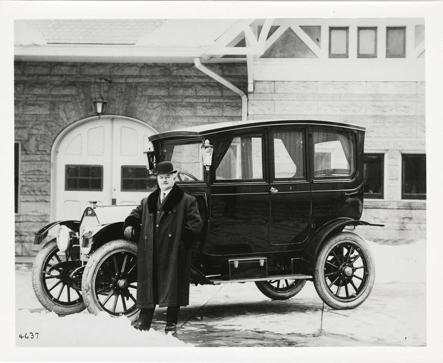 View of Joseph A. Rink posing with a 1912 Cole limousine. Handwritten on back: "Joseph A. Rink & his 1912 Cole limousine."