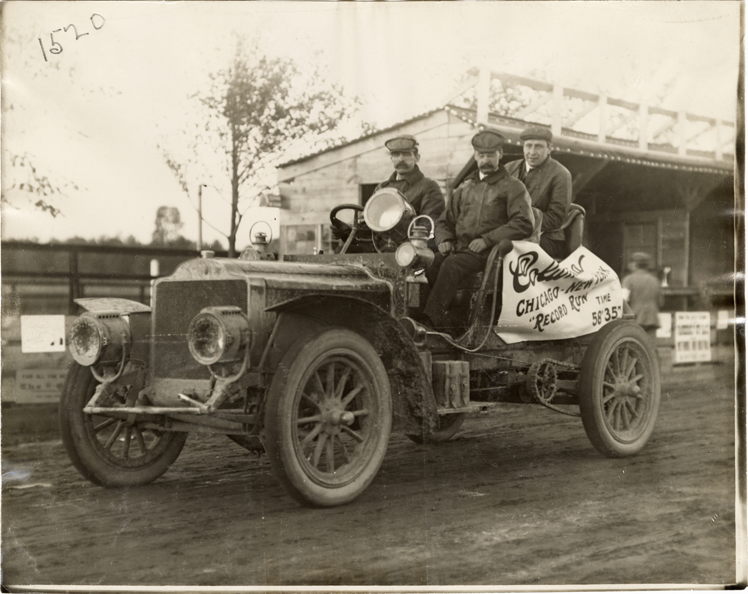View of motorists posing in Columbia car. Banner on car reads: "Columbia, Chicago-New York record run, time 58' 35"." Handwritten on back: "Columbia, c.1904."