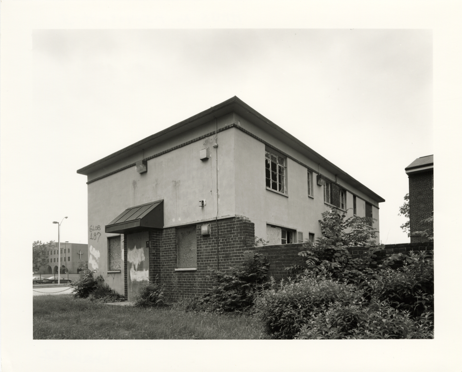 View of building 201, a Type 1 World War II era building, Parkside Homes and Addition. Located at Connor and East Warren Avenues, Parkside Homes was the first federally-funded low-income public housing project built in Detroit and Michigan. Finding aid: "View west, rear and east end of building 201."