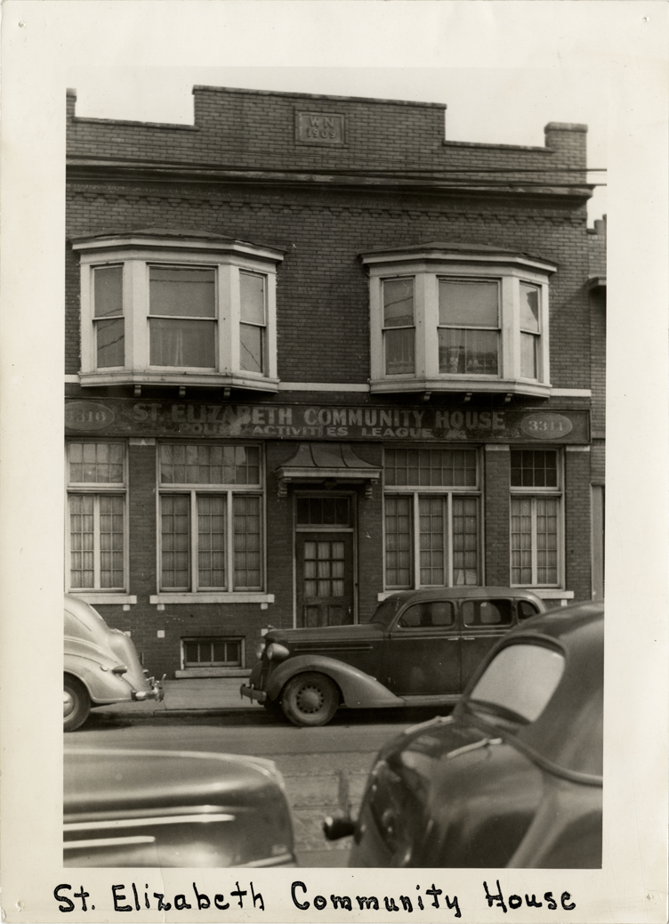 View of the St. Elizabeth Community House. Sign on building reads: "St. Elizabeth Community House. Polish Activities League." Automobiles in foreground. Handwritten on front: "St. Elizabeth Community House."