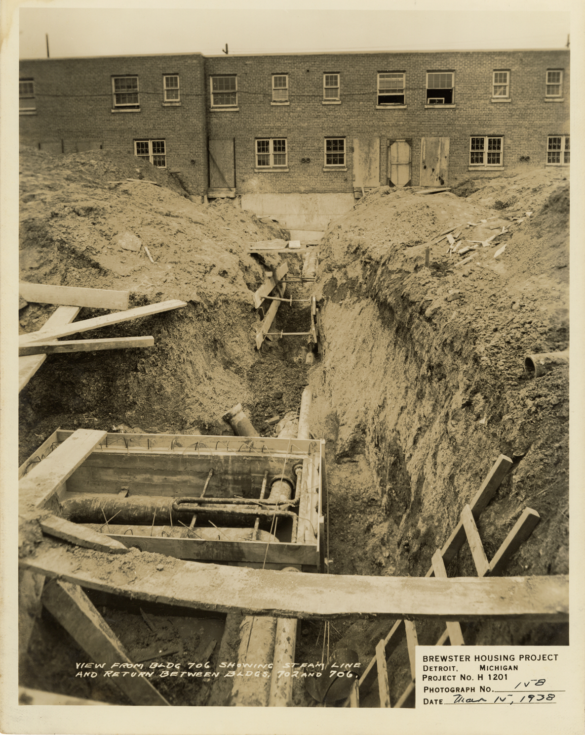 View of steam line between Building no. 702 and no. 706, Brewster Housing Project during construction. Printed on front: "View from Bldg. 706 showing steam line and return between Bldgs. 702 and 706. Brewster Housing Project. Detroit, Michigan. Project no. H 1201. Photograph no. 158. Date: Mar. 15, 1938."
