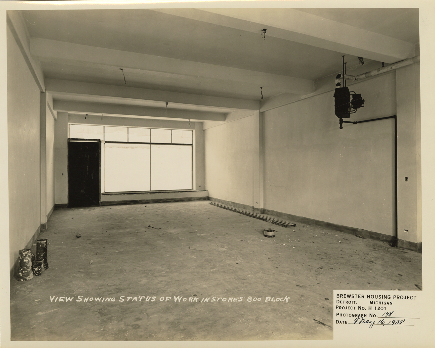 Interior view of stores in 800 block during construction, Brewster Housing Project. Printed on front: "View showing status of work in stores, 800 block. Brewster Housing Project. Detroit, Michigan. Project no. H 1201. Photograph no. 198. Date: May 16, 1938."