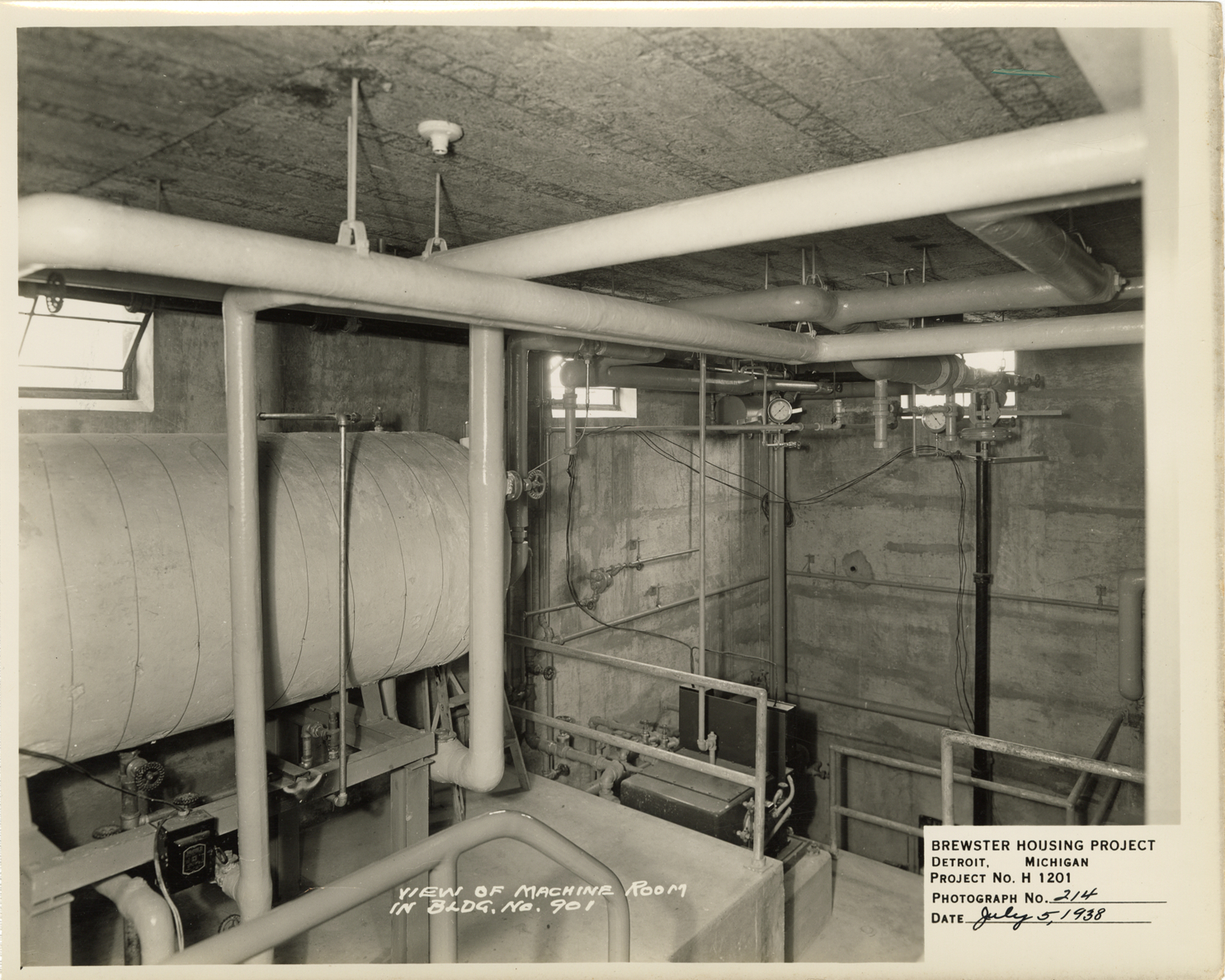 View of water heaters and other equipment in machine room of Building no. 901 during construction, Brewster Housing Project. Printed on front: "View of machine room in Bldg. 901. Brewster Housing Project. Detroit, Michigan. Project no. H 1201. Photograph no. 214. Date: July 5, 1938."