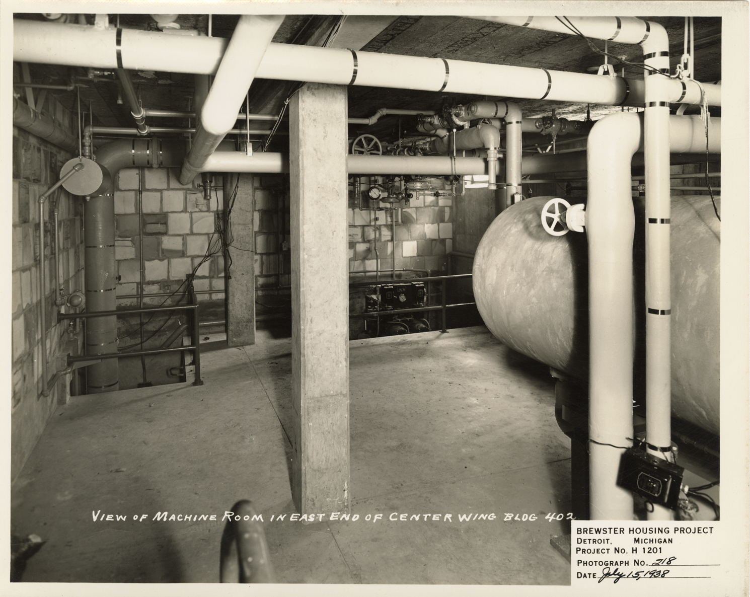View of water heaters and other equipment in machine room of Building no. 402 during construction, Brewster Housing Project. Printed on front: "View of machine room in east end of center wing, Bldg. 402. Brewster Housing Project. Detroit, Michigan. Project no. H 1201. Photograph no. 218. Date: July 15, 1938."