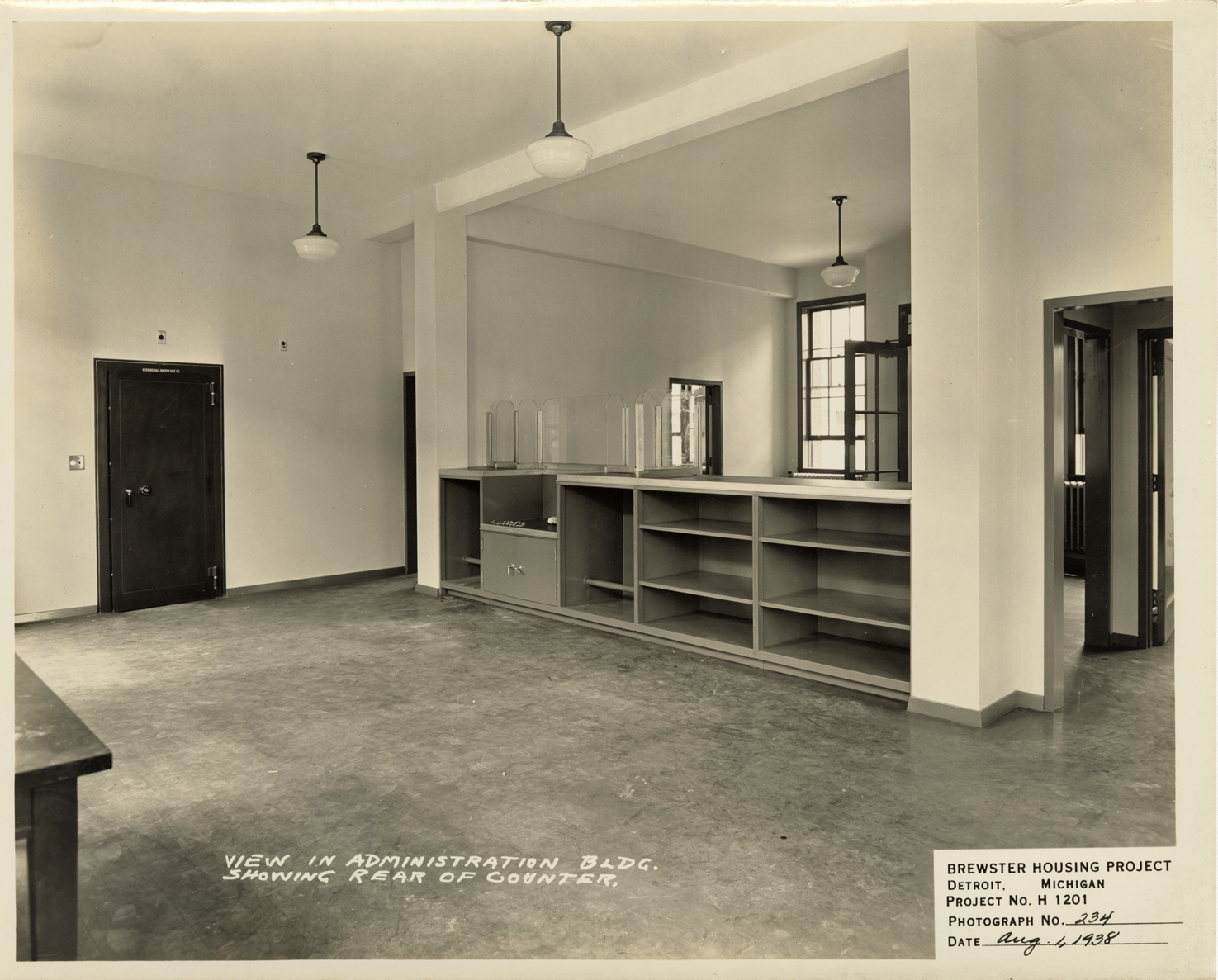 Rear view of counter in the Administration Building, Brewster Housing Project during construction. Printed on front: "View in Administration Bldg. showing rear of counter. Brewster Housing Project. Detroit, Michigan. Project no. H 1201. Photograph no. 234. Date: Aug. 1, 1938."