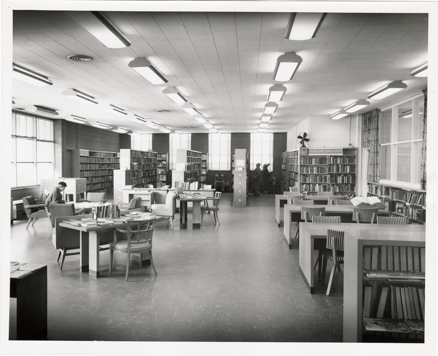 View of the interior of the Franklin Branch Library, Detroit Public Library. Room is furnished with desk, tables, chairs and bookshelves. Stamped on back: "Photo by Phil Olsen. #5721. 19219 Greeley. Detroit 3, TW. 1-2455."
