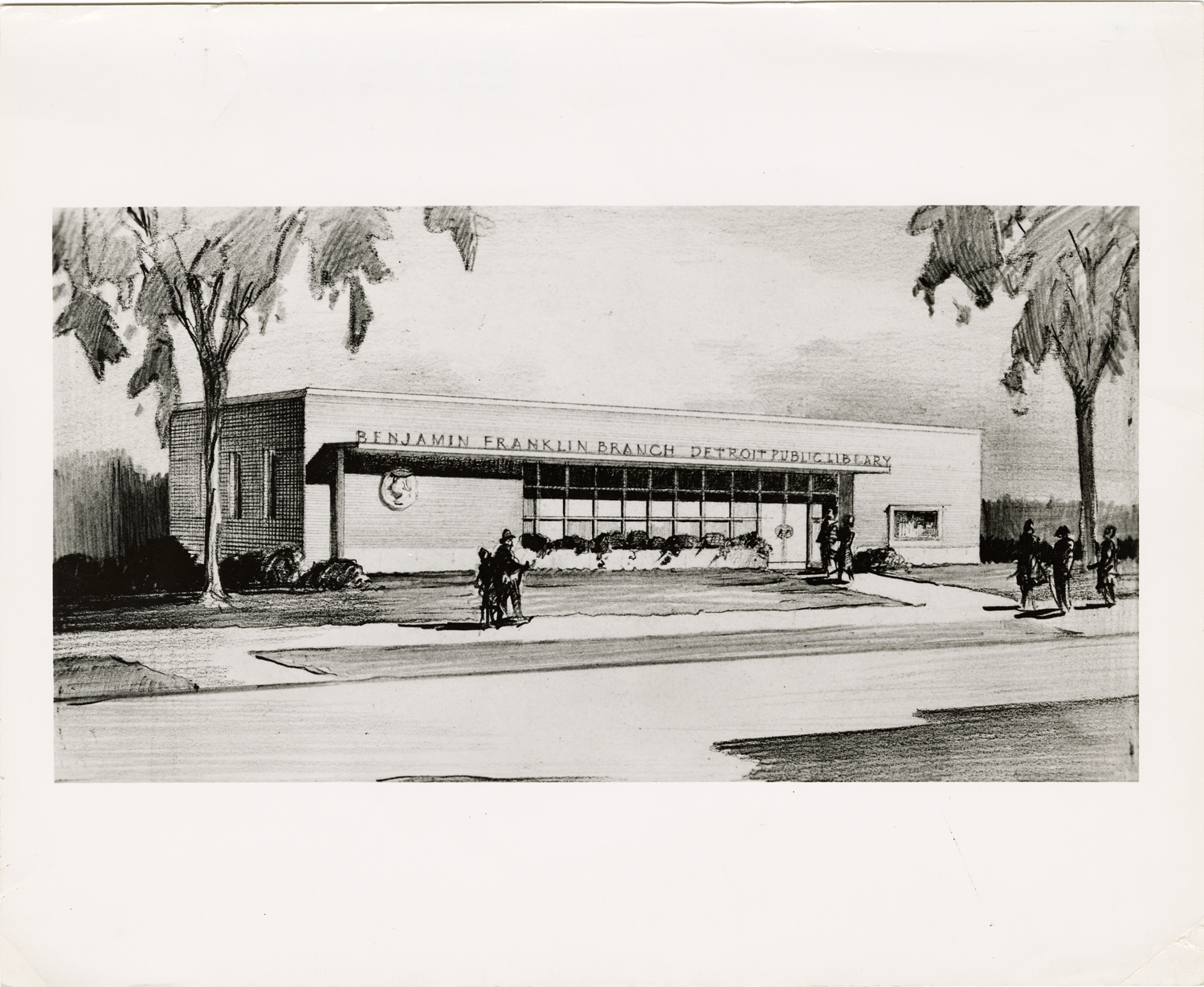 Artist's depiction of the Franklin Branch Library, Detroit Public Library. Typed on back: "Detroit Public Library, Benjamin Franklin Branch, opened Jan. 24, 1950."