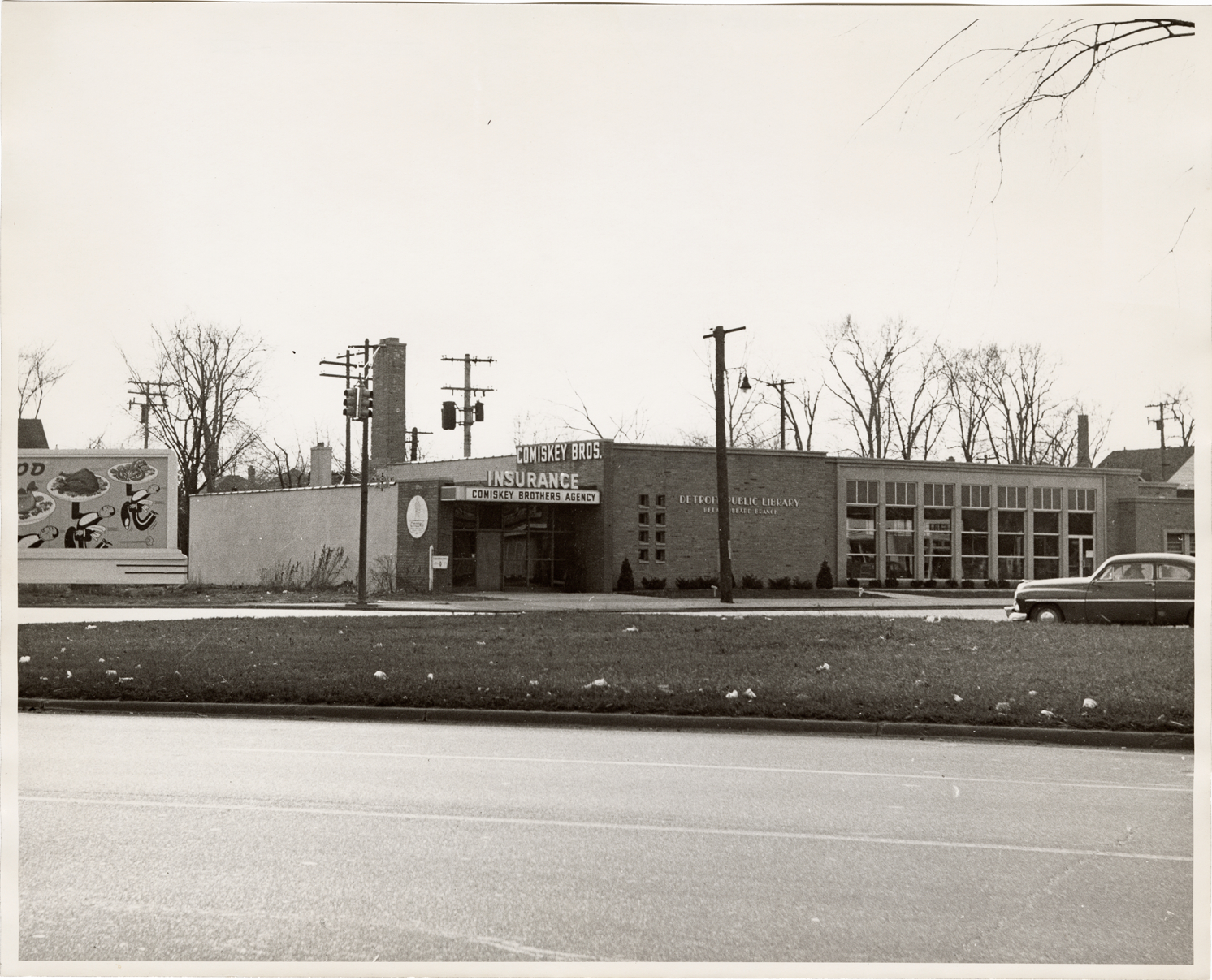 View of the Hubbard Branch Library, Detroit Public Library. Comiskey Brothers insurance agency building on left. Typed on back: "Hubbard Branch, site." Handwritten on back: "Hubbard Branch, building, exterior view."
