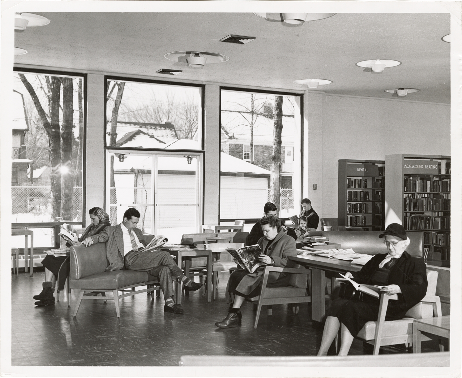 View of men and women reading at Jefferson Branch Library, Detroit Public Library. Room is furnished with tables and chairs; bookshelves in background. Label on back: "Interiors: Thomas Jefferson Branch Library, 12350 E. Outer Drive. Opened, October 1, 1951." Handwritten on back: "Jefferson Branch. Building, interior view, adult reading area. Photo taken in 1955."