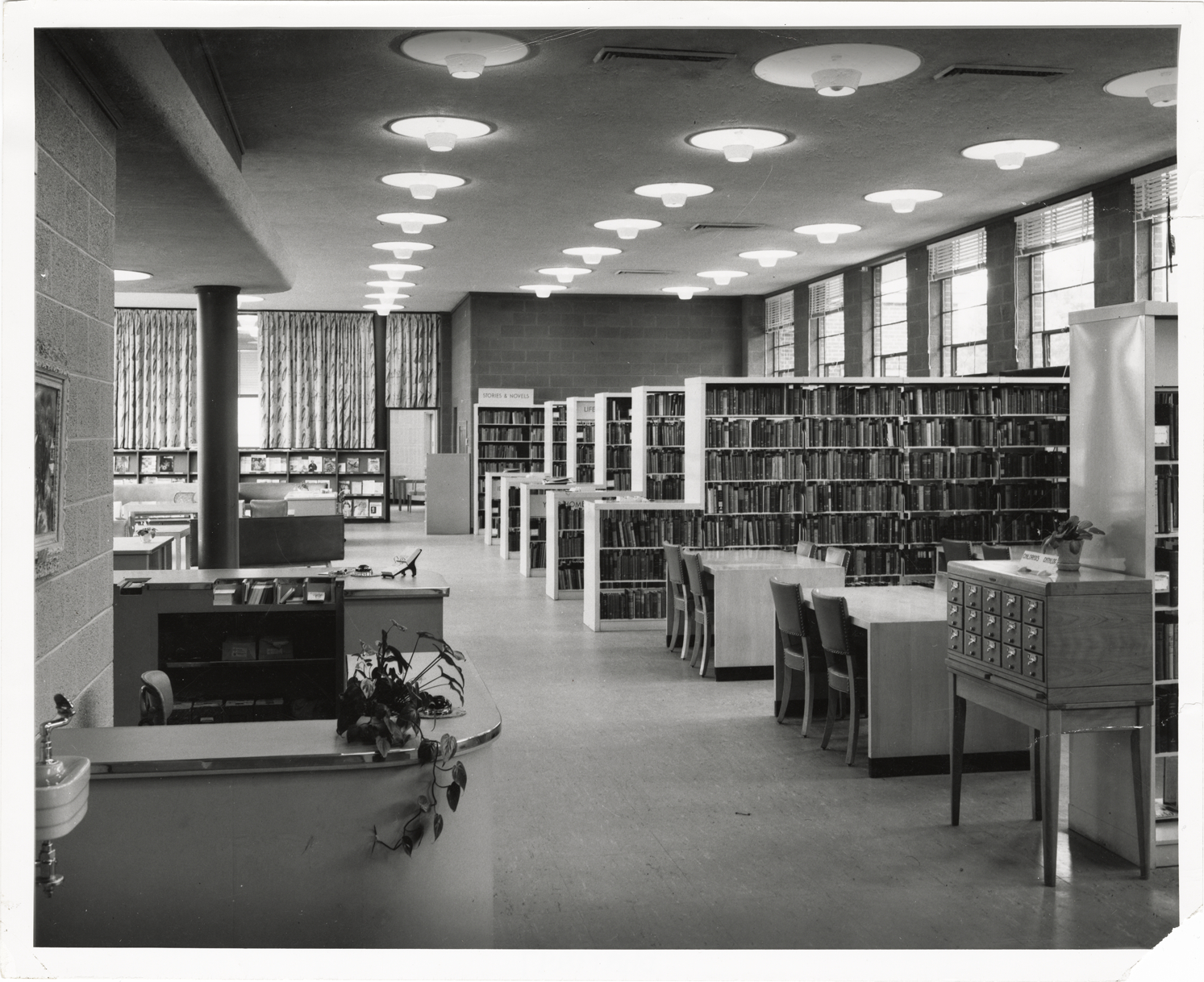 View of the interior of the Sherwood Forest Branch Library, Detroit Public Library. Room is furnished with tables, chairs, desk and bookshelves. Label on back: "Detroit Public Library, Sherwood Forest Branch, 7117 W. Seven Mile Road, Detroit 21, Michigan. Dedicated Feb. 20, 1951." Stamped on back: "Olsen Photographic. TO. 8-6230. LI. 7-4679. #4681. 11527 Jos. Campau. Detroit 12, Michigan."