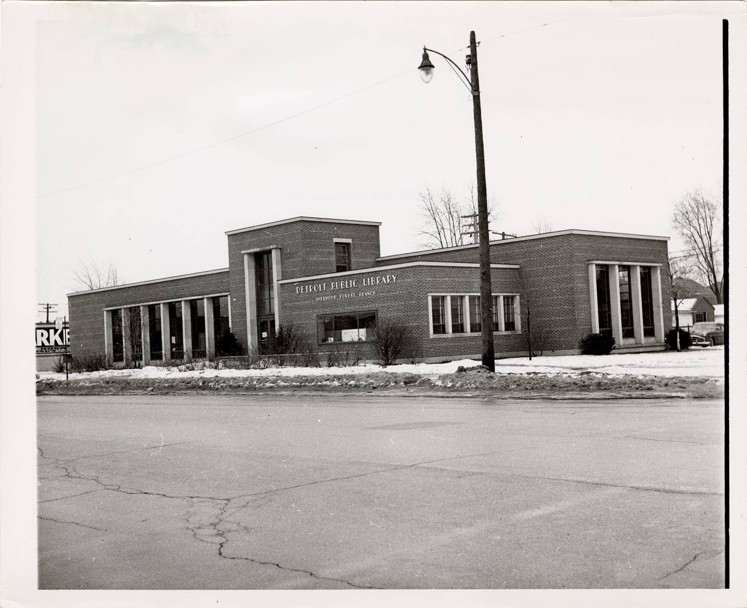 View of the Sherwood Forest Branch Library, Detroit Public Library. Handwritten on back: "Sherwood Forest Branch, exterior view. Photo taken in 1952."