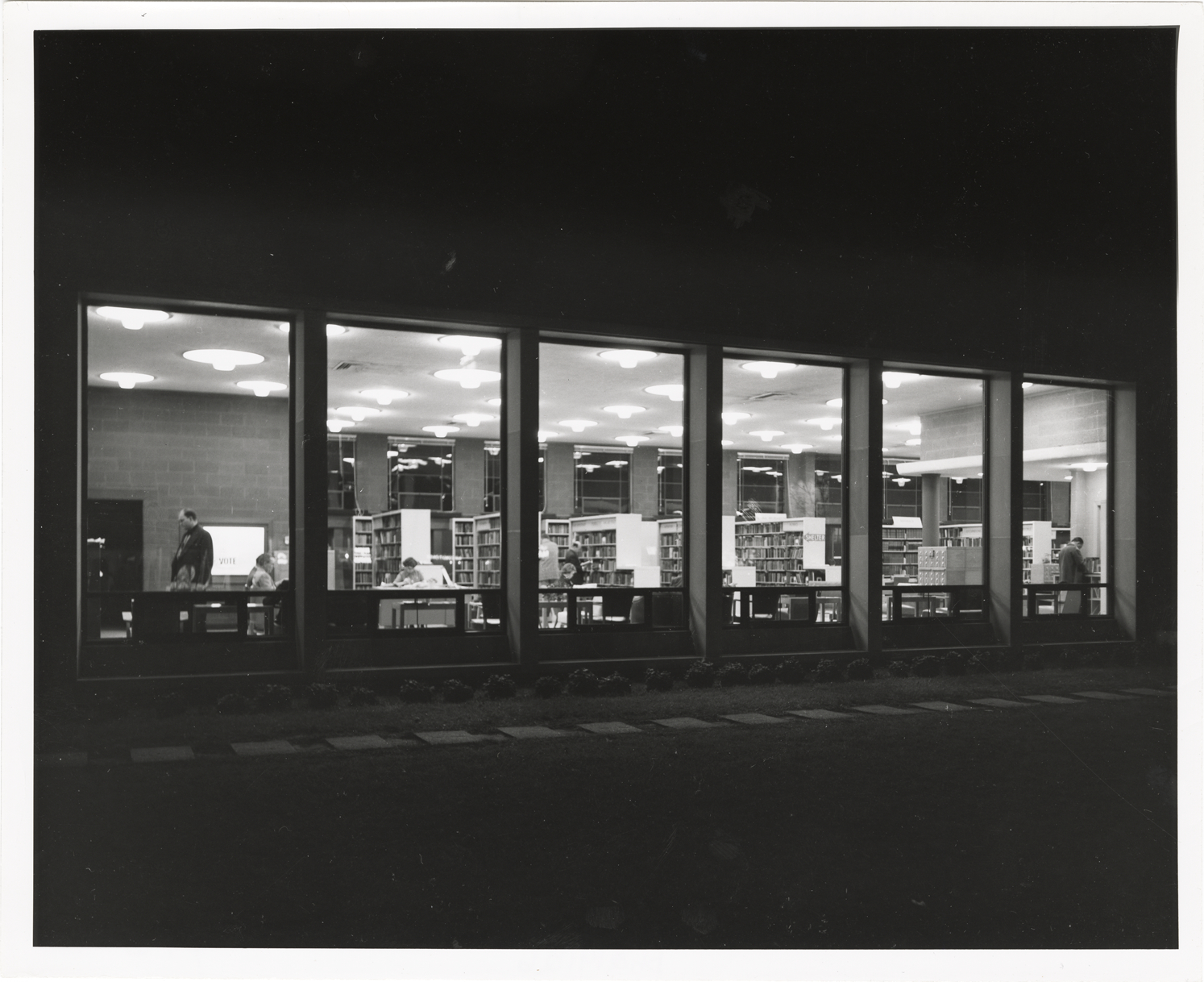 Nighttime view from windows of the interior of the Sherwood Forest Branch Library, Detroit Public Library. Stamped on back [covered by label]: "Olsen Photographic. 11527 Jos. Campau Ave. TO. 8-6230. LI. 7-4679. Detroit 12, Michigan." Typed on back: "Detroit Public Library, Sherwood Forest Branch. Picture taken Oct. 1952." Handwritten on back: "Sherwood Forest Branch, building, interior, night view I. Photo taken in 1952."