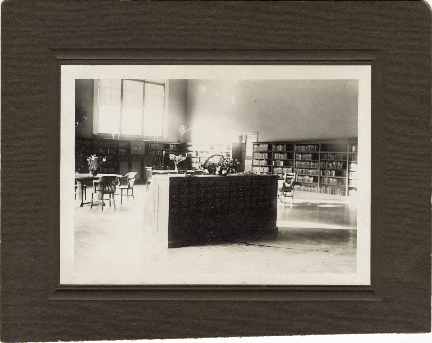 View of the interior of the Utley Branch Library, Detroit Public Library. Room is furnished with tables, chairs and a card catalog. Handwritten on back: "Utley Branch, adult room, interior view, 1913."