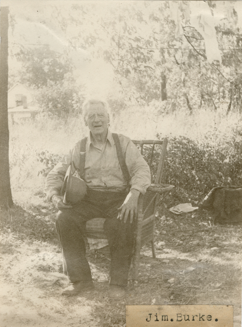 Portrait of Jim Burke. Burke sits on rustic chair, holding a hat. Label on front: "Jim Burke."