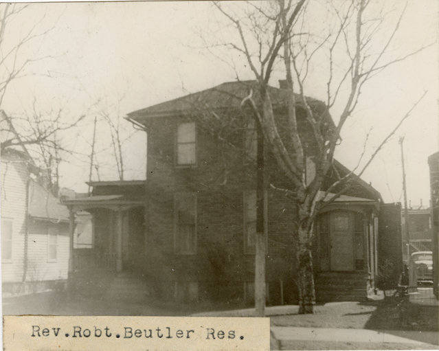View of the Reverend Robert Beutler residence in the Delray neighborhood. Two-story house has covered entry porches. Label on front: "Rev. Robt. Beutler res."