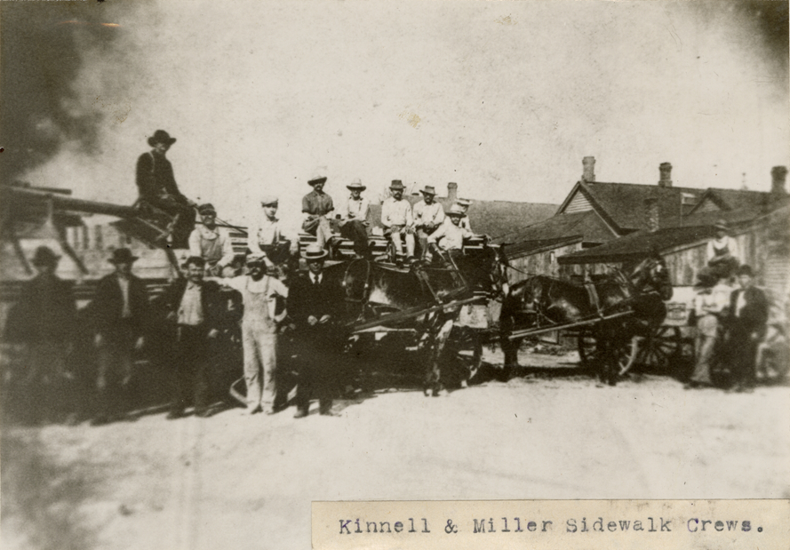 View of workers from Kinnell & Miller posing with horse-drawn wagons during sidewalk construction, Delray neighborhood. Label on front: "Kinnell & Miller sidewalk crews."