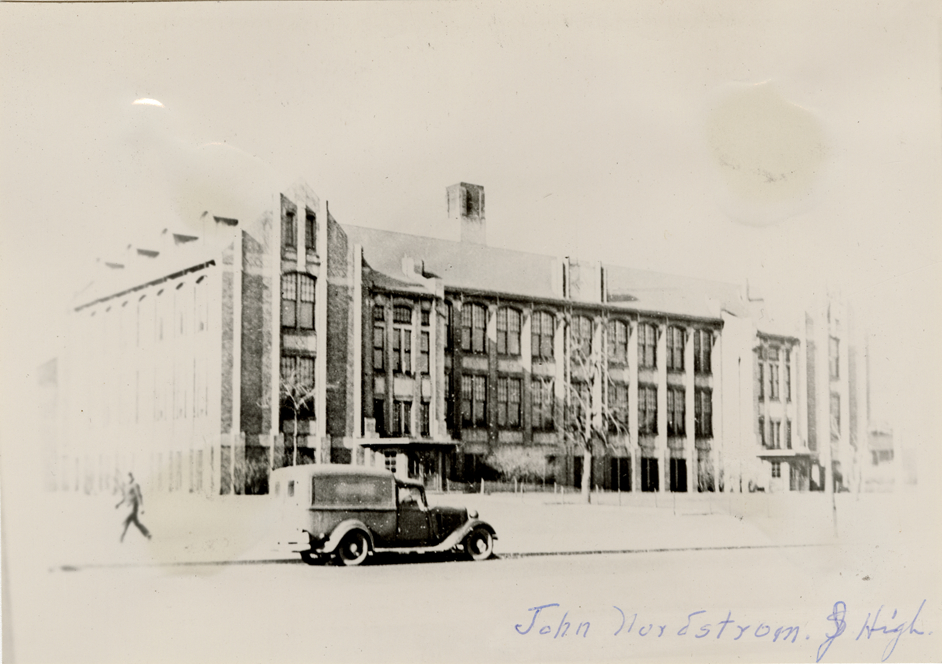 View of John Nordstrom Junior High School, Delray neighborhood. Car is parked in street. Handwritten on front: "John Nordstrom Jr. High."