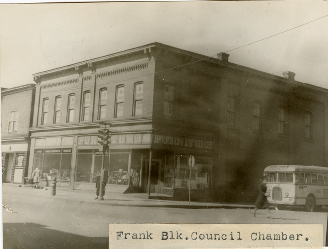 View of commercial buildings in the Frank Block, Delray neighborhood. Bus on corner. Label on front: "Frank Blk. council chamber."