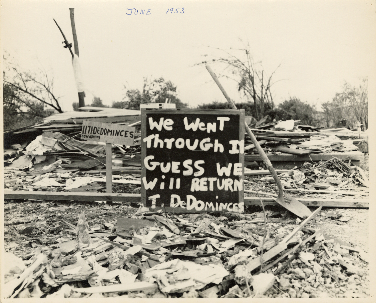 View of a sign in front of the wreckage of the DeDominces residence, which was destroyed by tornado that touched down in Beecher, a community near Flint, Michigan. Shovel leans against sign, which reads: "We went through it. Guess we will return. T. DeDominces." Smaller sign reads: "1171 DeDominces. Now staying." Handwritten on front: "June 1953." The tornado, which struck Genesee County, Michigan on June 8, 1953, is considered to be one of the deadliest tornadoes in U.S. history.