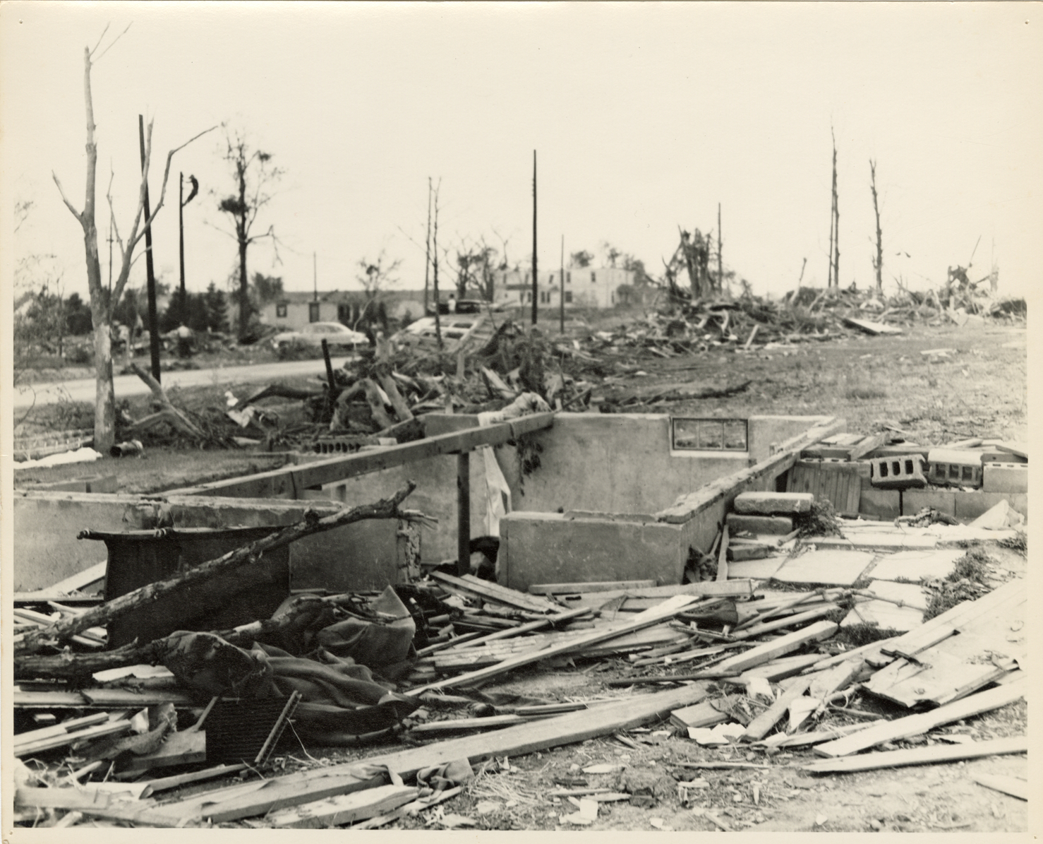 View of a house destroyed by tornado that touched down in Beecher, a community near Flint, Michigan. Debris in foreground and background. The tornado, which struck Genesee County, Michigan on June 8, 1953, is considered to be one of the deadliest tornadoes in U.S. history.