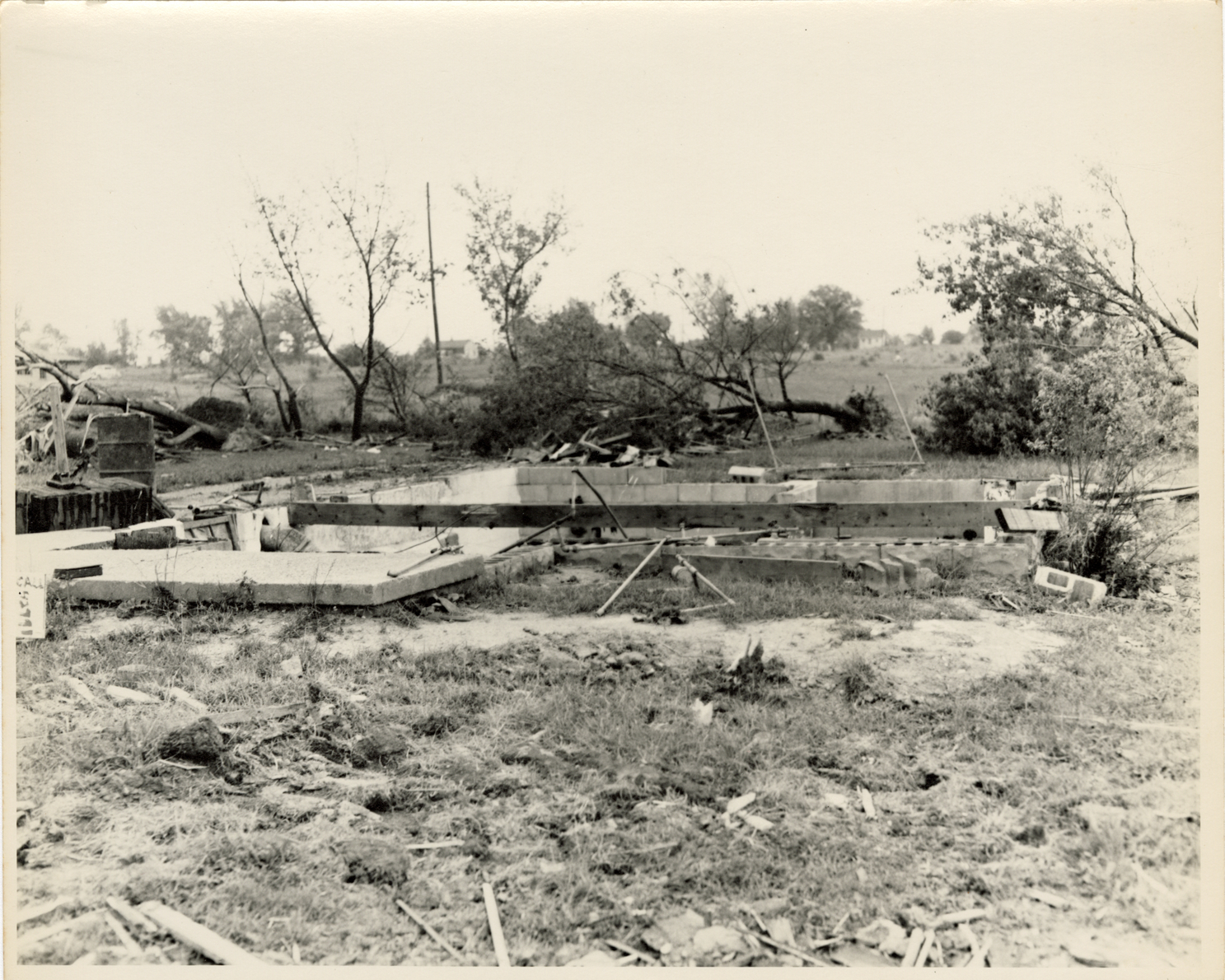View of a house destroyed by tornado that touched down in Beecher, a community near Flint, Michigan. The tornado, which struck Genesee County, Michigan on June 8, 1953, is considered to be one of the deadliest tornadoes in U.S. history.