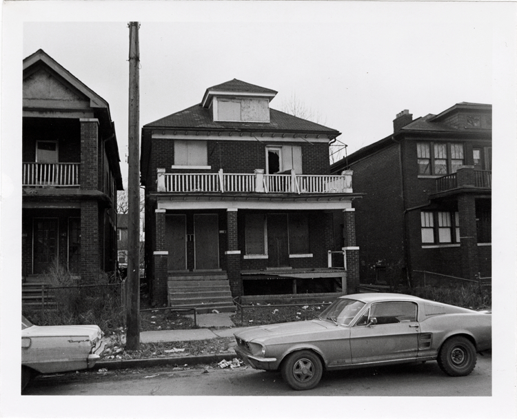 View of an abandoned house, possibly a duplex, located at 1627-1629 Blaine. Two-story house has covered entry porch; car parked in street. Stamped on back: "Photography by D. Bruce Banta, Detroit." Handwritten on back: "1627-29 Blaine. Parcel 47."