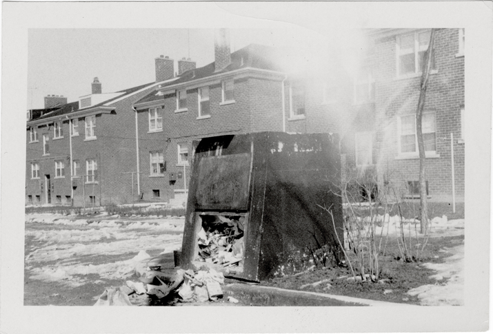 View of trash burning in a small incinerator behind an apartment building, possibly located on Monte Vista. Handwritten on back: "Monte Vista court. Roemer."