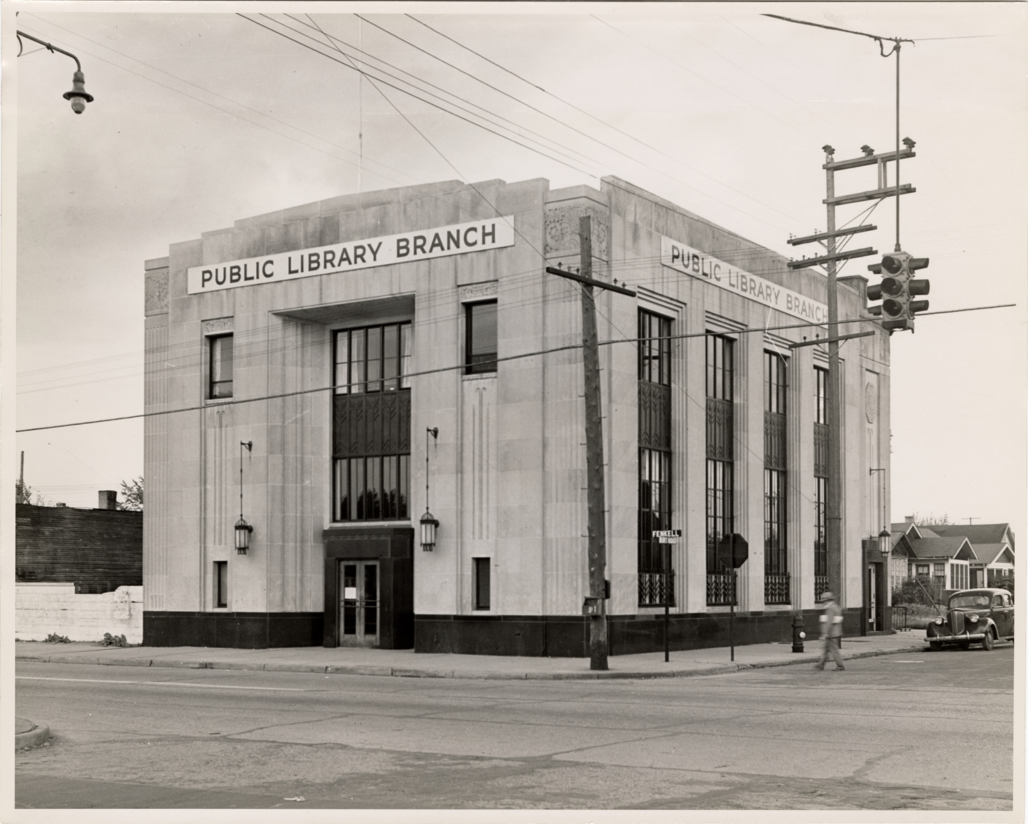 View of the Williams Branch Library, Detroit Public Library. Handwritten on back: "Roger Williams, Fenkell at Burt."